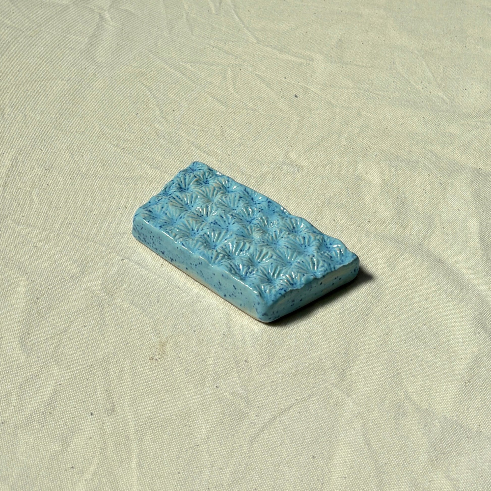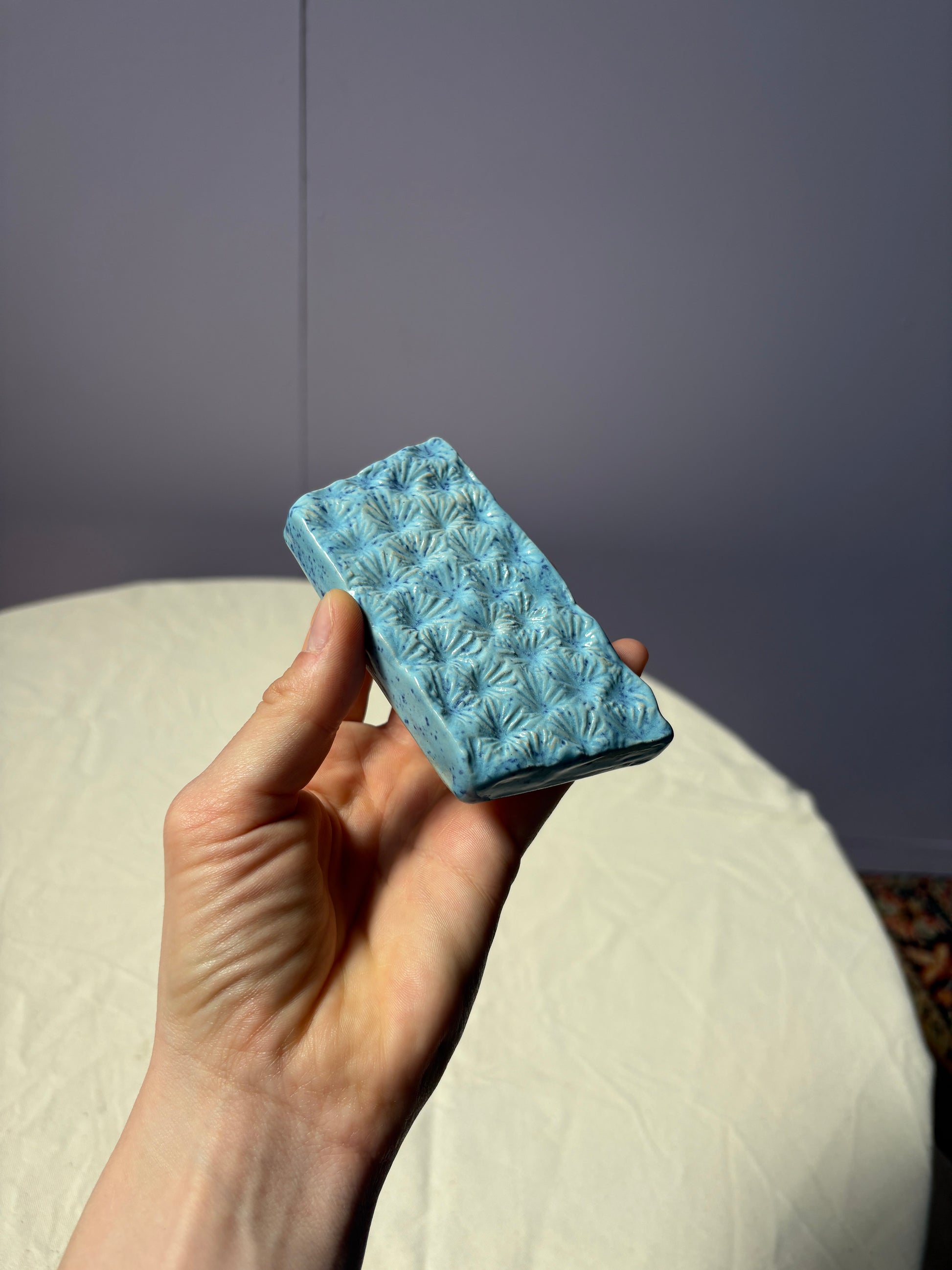 Leuk als cadeau of voor jezelf. Een smalle shiny lichtblauwe zeephouder met en luchtbed stempel patroon